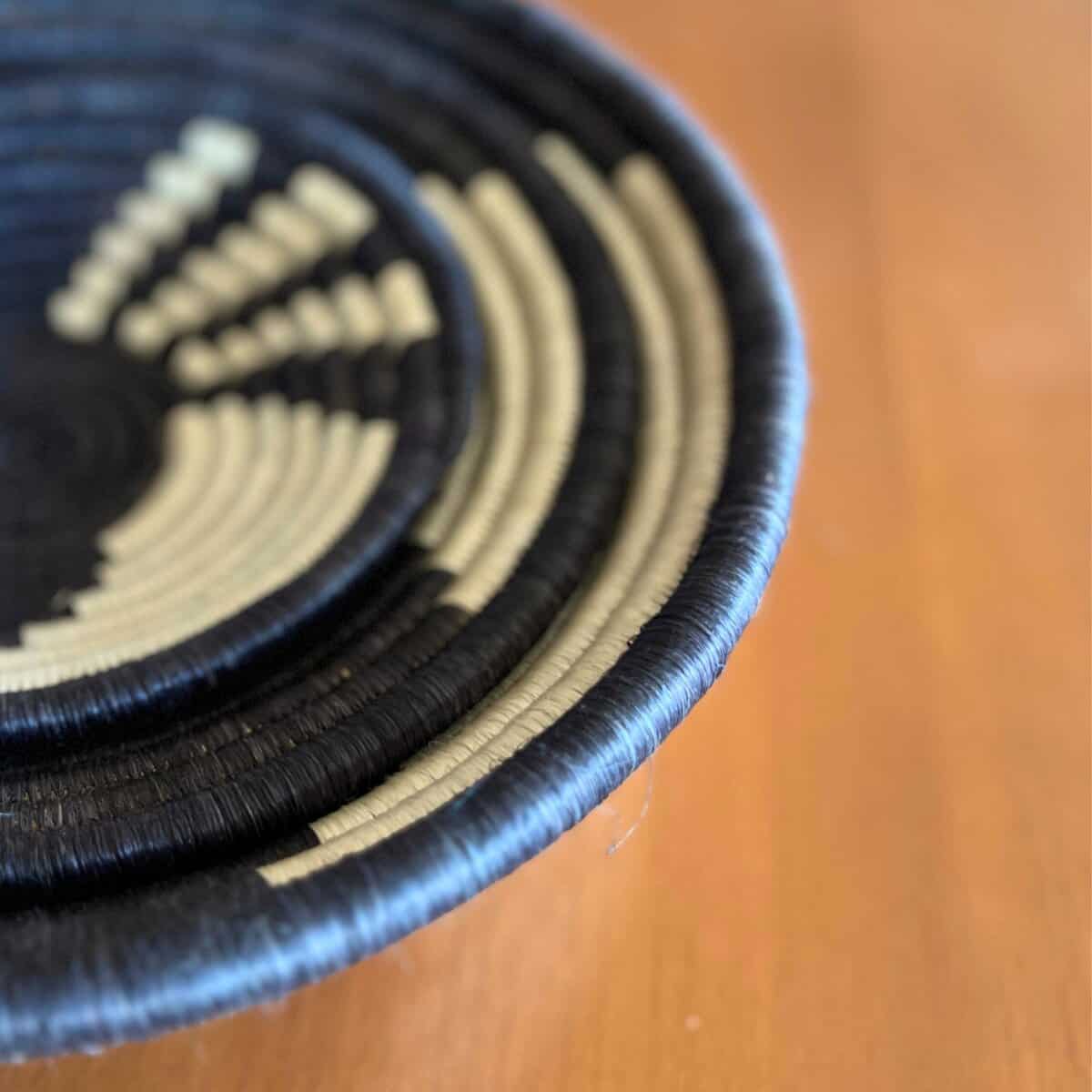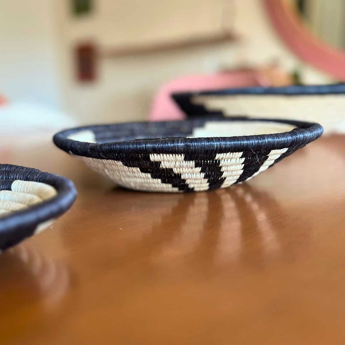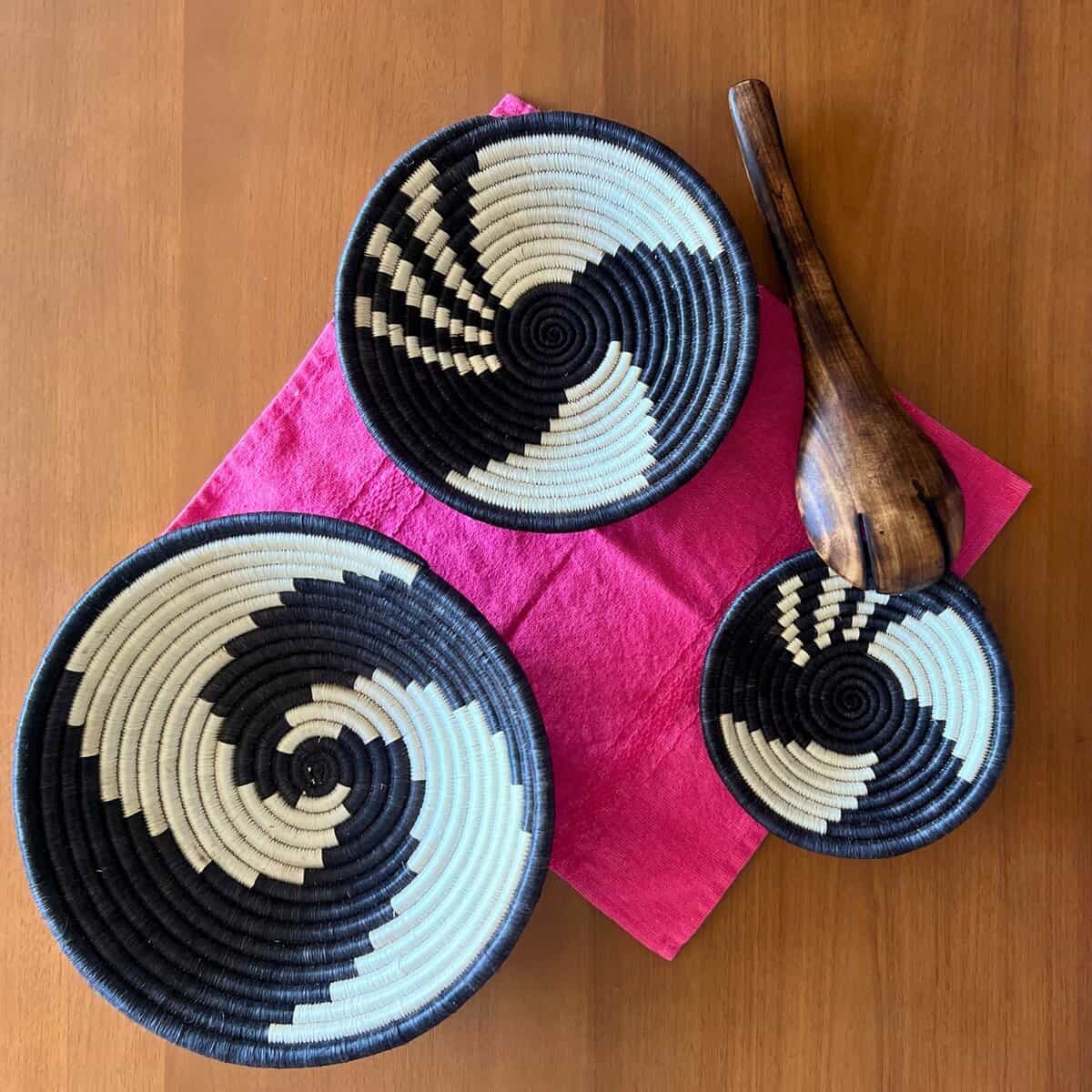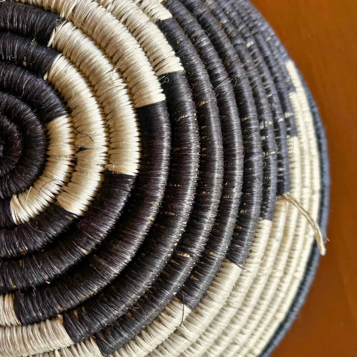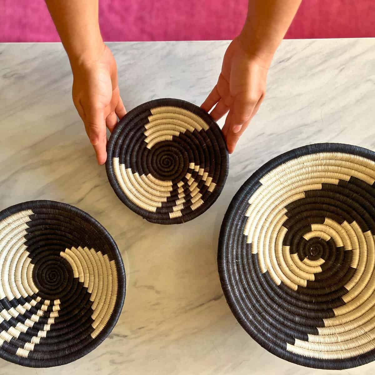 Handwoven in Uganda using age-old coiling techniques, these baskets combine heritage with contemporary design. The pattern features bold black and white spirals, a striking contrast that feels both modern and timeless, like movement captured in stillness.