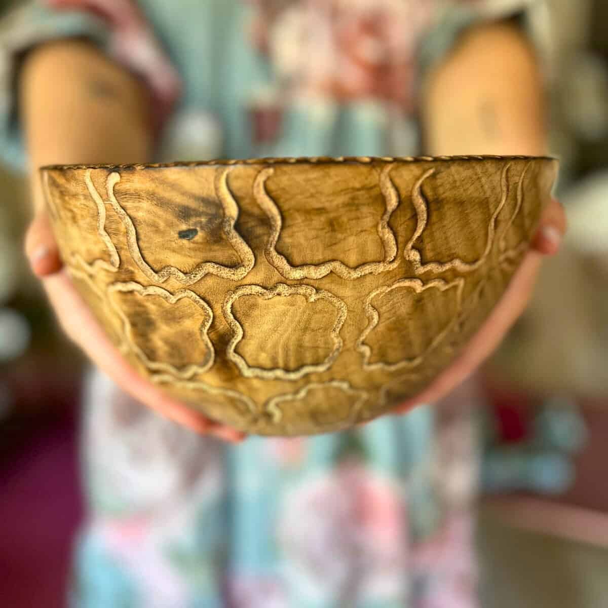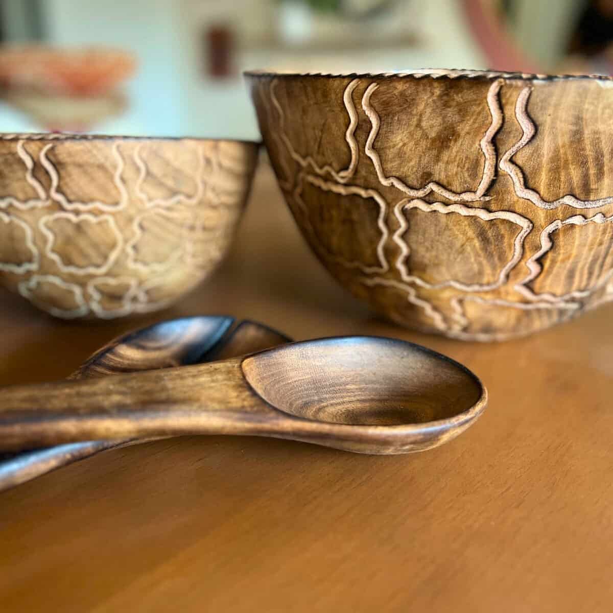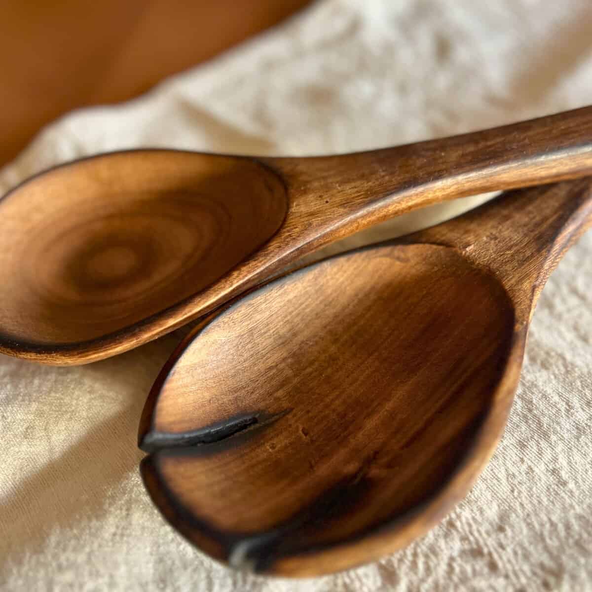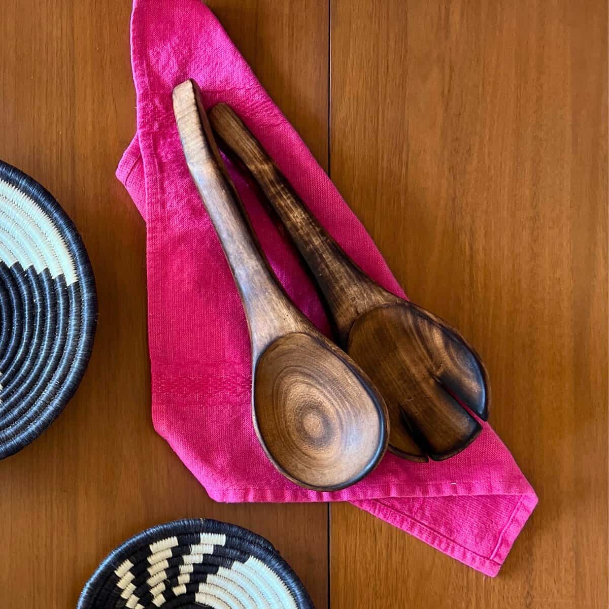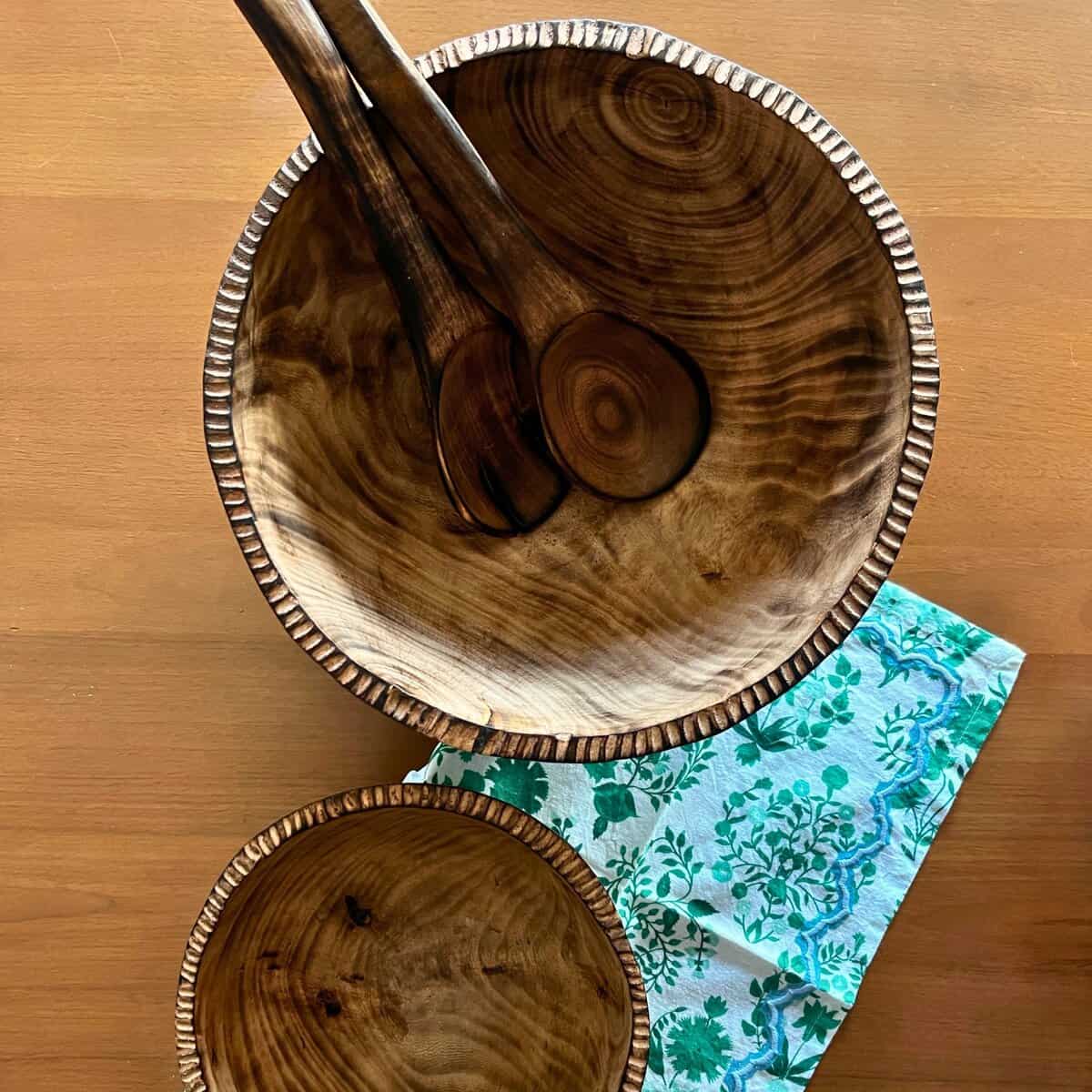 The set includes one large bowl, one smaller companion bowl, and a matching pair of serving tongs. Each piece is carved, sanded, and finished by hand, leaving behind small variations that make every set unique.