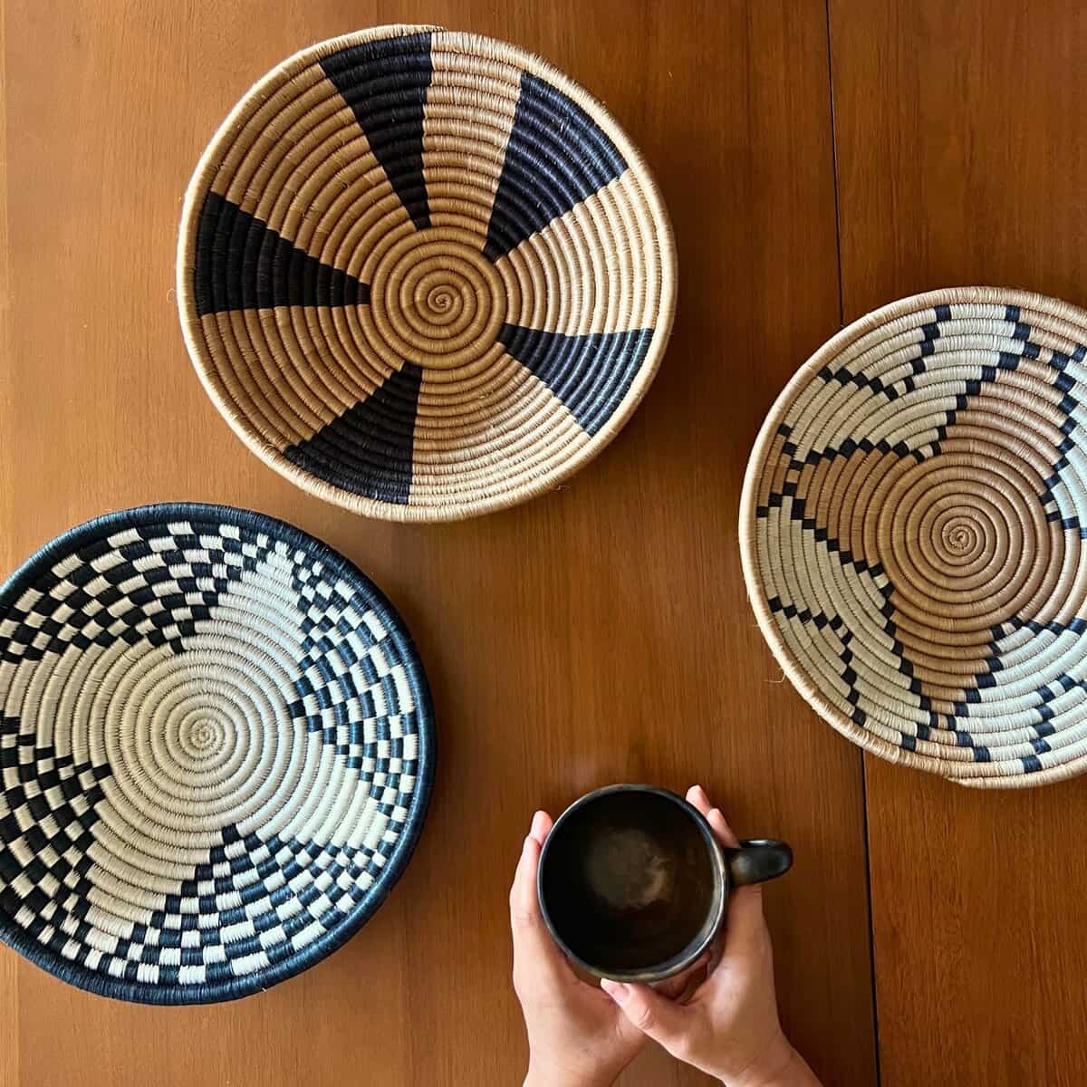 Handwoven in Uganda by women artisans using age-old coiling techniques, these baskets showcase the natural beauty of raffia fiber in shades of sand, indigo, and black. The geometric patterns are timeless yet modern, echoing the rhythm of handwork and the balance of everyday life.