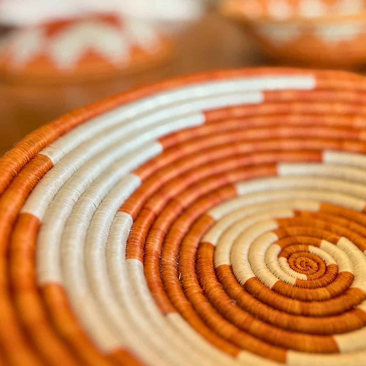 The design features soft ivory against rich terracotta, a palette inspired by the Ugandan landscape, where clay soil and sunlit grasslands meet. Each pattern tells a slightly different story, blending geometric precision with the freedom of handwork.